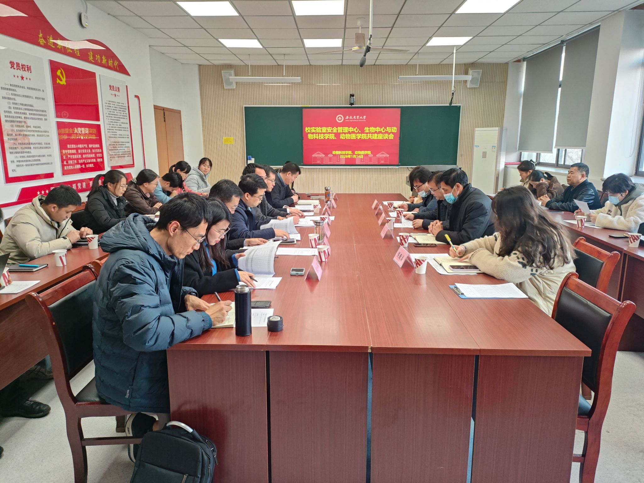本网讯 为进一步筑牢校园实验室安全防线,强化跨部门协同联动机制,提升动物类、生物类实验室安全管理规范化水平,2026年1月14日下午,校实验室安全管理中心、生物中心与动物医学院、动物科技学院联合召开实验室安全共建座谈会。实验室安全管理中心、生物技术中心主任王涛、副主任郭晓东及科室相关人员、双方学院党政领导班子成员、系部主任、各实验室安全责任人、实验室安全联络员等参加会议。