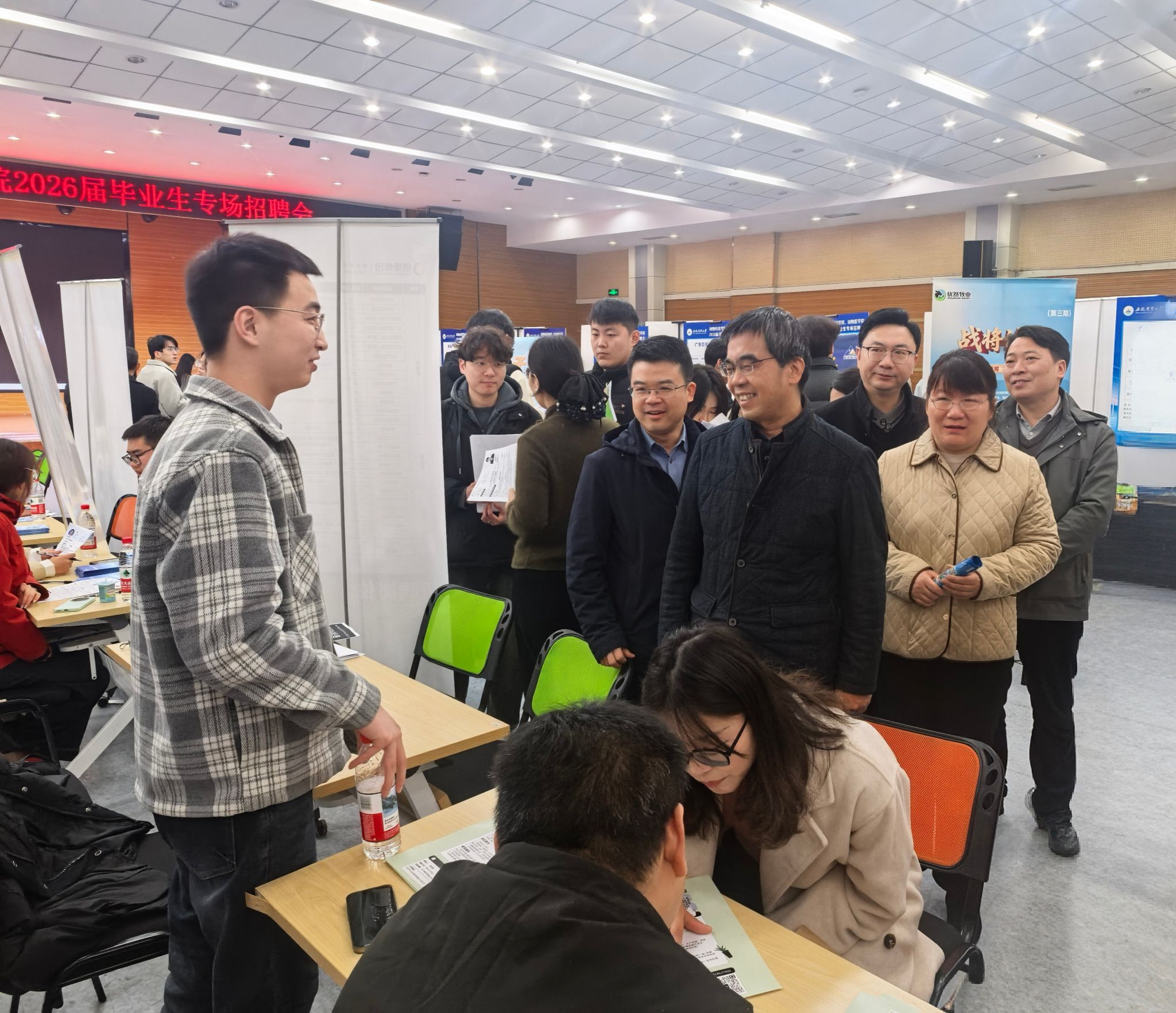 本网讯 3月18日上午,我校在欣苑4楼大学生活动中心举办2026届动医动科类毕业生专场招聘会。校党委常委、副校长蔡德军出席,校党委学工部负责人,动物医学院、动物科技学院班子成员、全体辅导员及毕业生参加活动。
