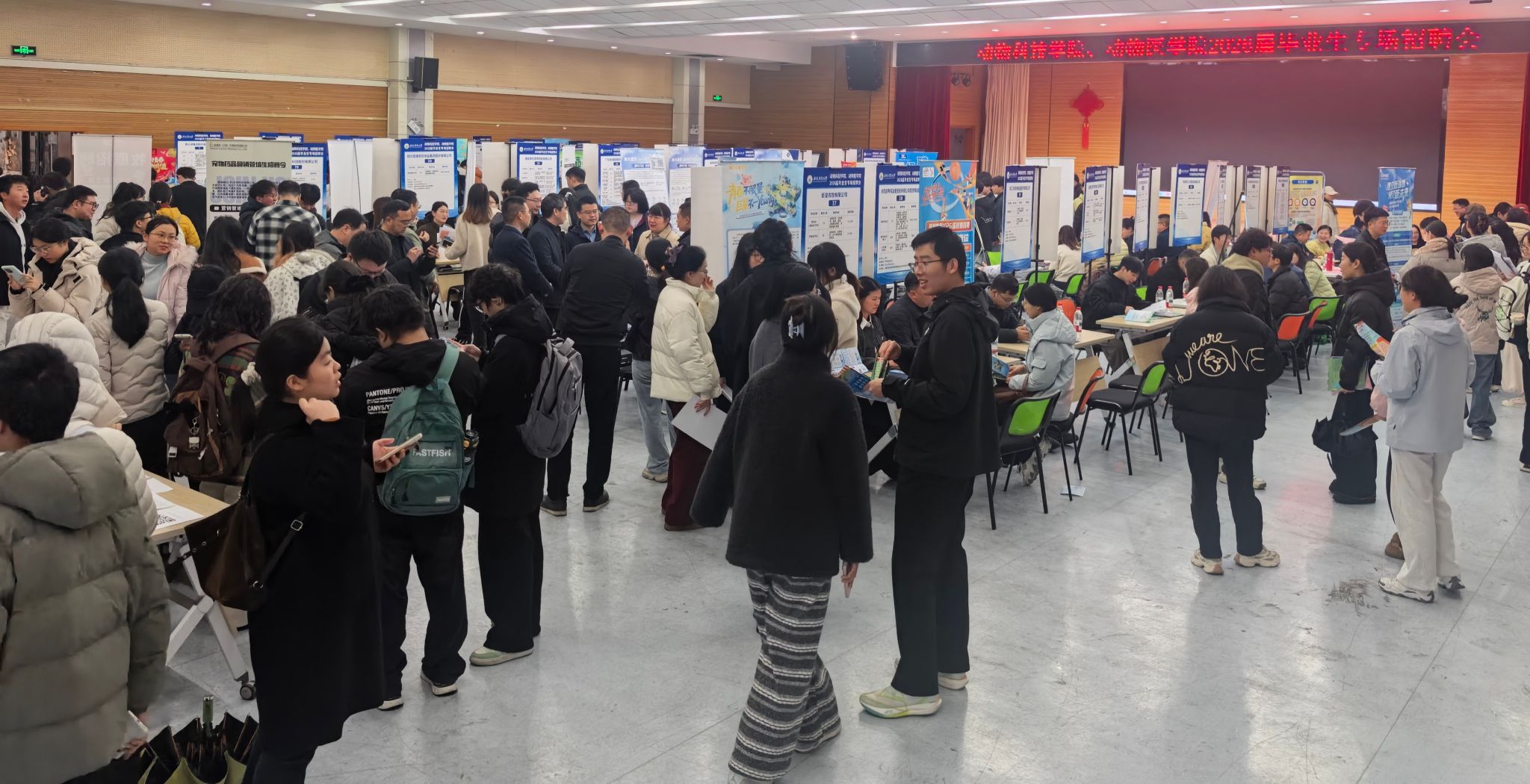 招聘会现场秩序井然、氛围热烈。温氏集团、牧原集团、双胞胎集团、正大集团、新瑞鹏集团、海大集团、通威集团等55家用人单位到场揽才,提供就业岗位1400余个,岗位需求覆盖动物医学、动物科学、水产养殖、动植物检疫等本、硕、博各学历层次毕业生,现场接收简历1100余份。招聘会还设置征兵服务台和简历加油站,为毕业生提供征兵政策解读和简历优化。