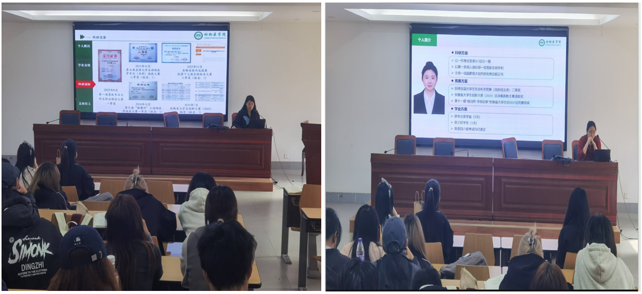 会上,分管教学院长结合学院办学历史、学科建设成果及动物医学行业发展趋势,全面解读了动物医学专业的内涵与价值,详细介绍了学院的师资力量、科研平台、人才培养方案及毕业生就业、升学前景和专业使命。指出,动物医学不仅是守护动物健康的“守护者”,更是保障公共卫生安全、推动畜牧业高质量发展、助力乡村振兴的重要力量,打破了转入学生对专业的片面认知。成功推免至中国农业大学、吉林大学的胡章玉、霍欣蕊两位优秀学长代表,结合自身学习经历,从日常学习积累、学术潜力锻造和综合素养提升,分享了保研成功经验,并介绍了个人在专业学习中的高效学习方法,鼓励学弟学妹合理规划时间,明确学习目标,脚踏实地走好每一步。