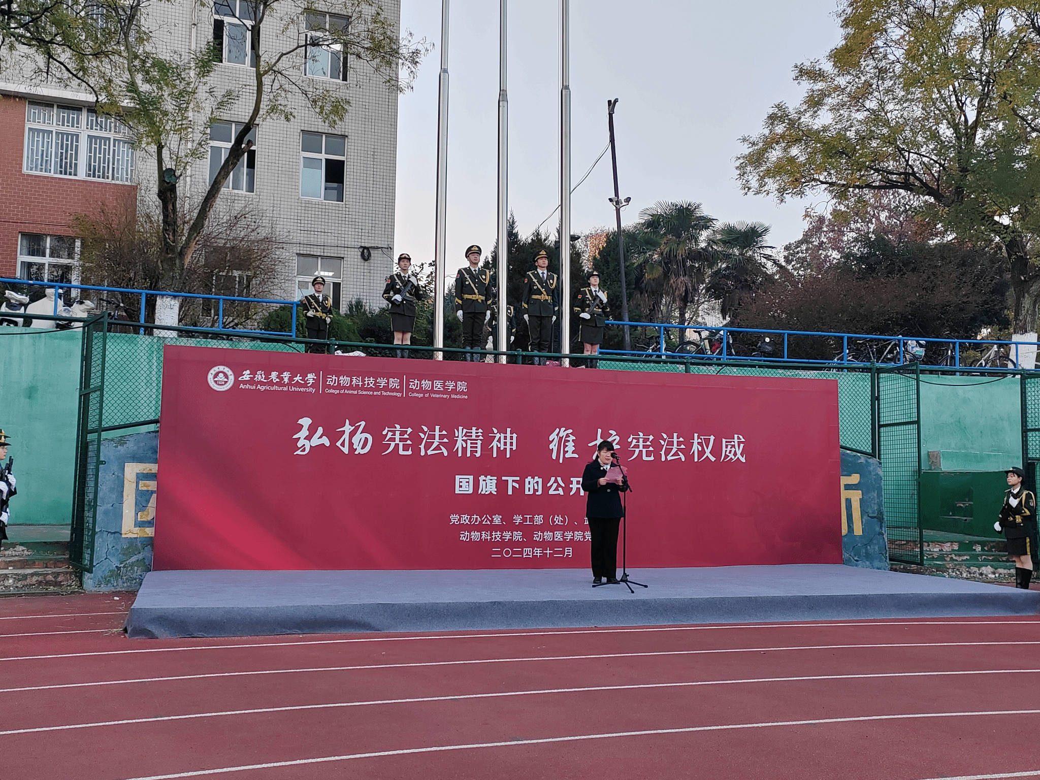 在庄严的国旗下,动物医学院专职辅导员杜亚娜生动讲述以《弘扬宪法精神 维护宪法权威》为主题的公开课,细致讲解《中华人民共和国宪法》部分条款,鼓励学院学子携手并进,共同为实现全面依法治国、建设社会主义法治国家的宏伟目标贡献自己的一份力量。