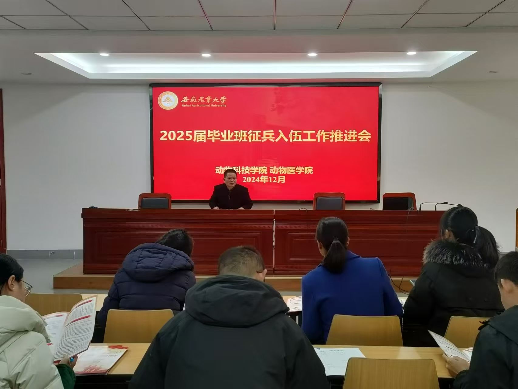本网讯 12月11日,动物科技学院、动物医学院在动科楼318召开2025届毕业班征兵入伍工作推进会。学院2025届毕业班辅导员参加此次会议。会议由动物医学院党委副书记章巍主持。