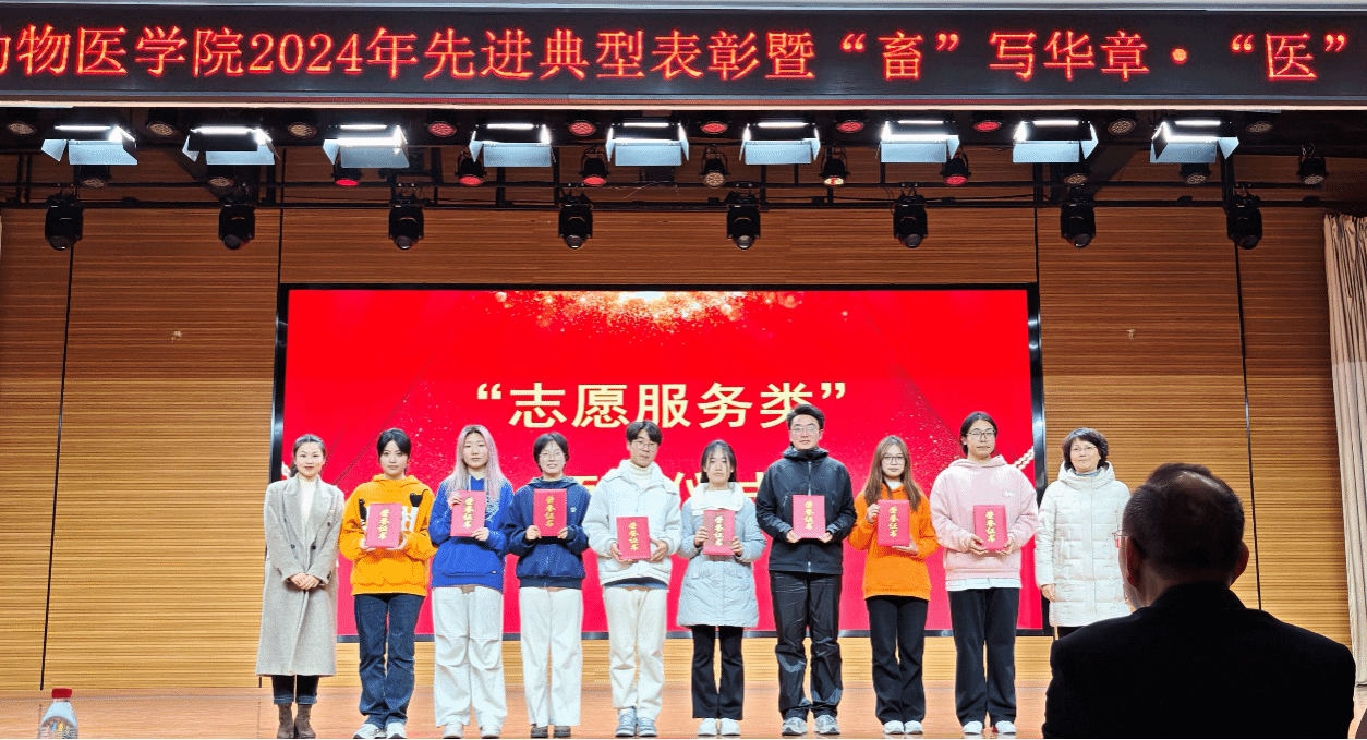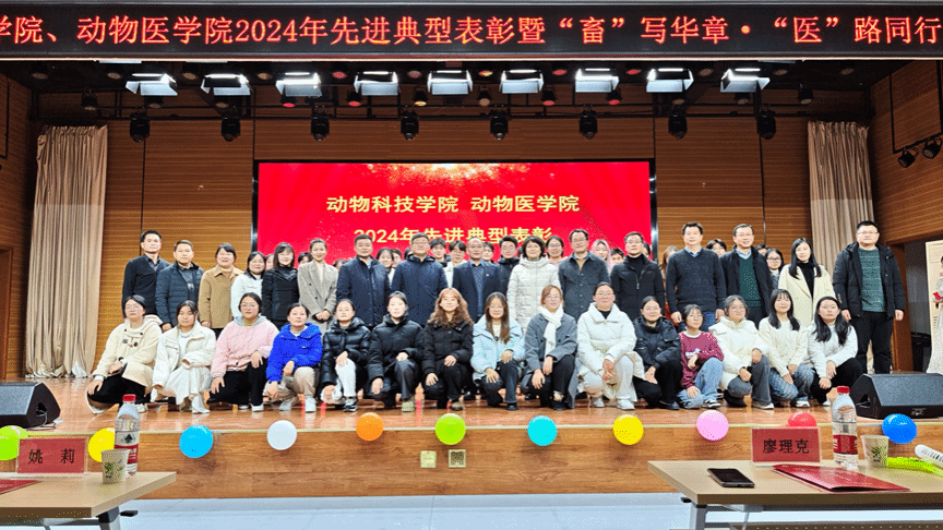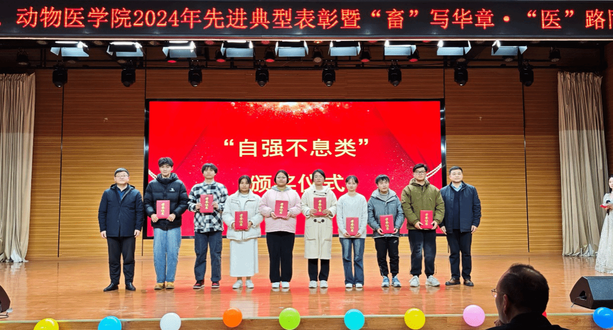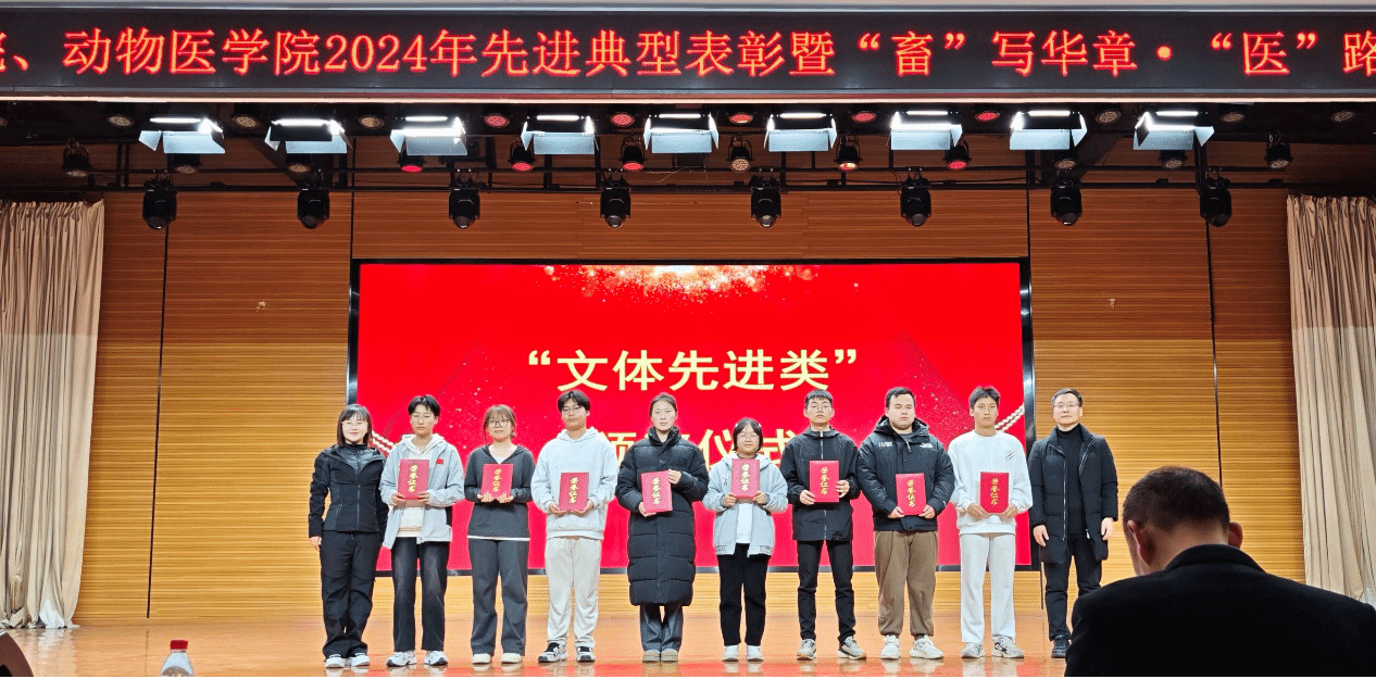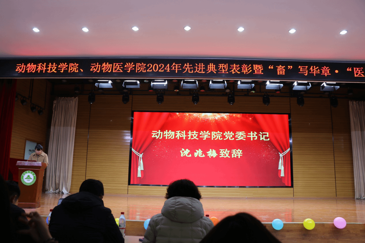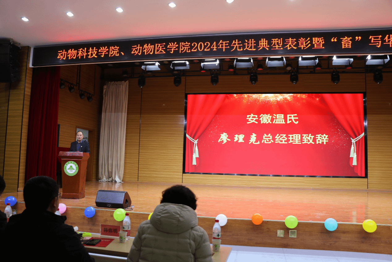 本网讯 12月24日晚动物科技学院、动物医学院于校欣苑食堂四楼小礼堂举行动物科技学院、动物医学院2024年先进典型表彰暨“畜”写华章,“医”路同行迎新晚会。校党政办公室主任戴照力、校党委组织部常务副部长韩弥明、校党委宣传部常务副部长姚莉、校学生处处长任琪、校团委副书记陈公伟、安徽温氏总经理廖理克、安徽温氏行政综合部经理祝宝璐、安徽温氏人力资源部经理王秀出席会议并为获奖同学颁奖。学院领导班子成员、系部正副主任,党支部书记、全体辅导员班主任老师及2024级全体同学参加本次晚会。