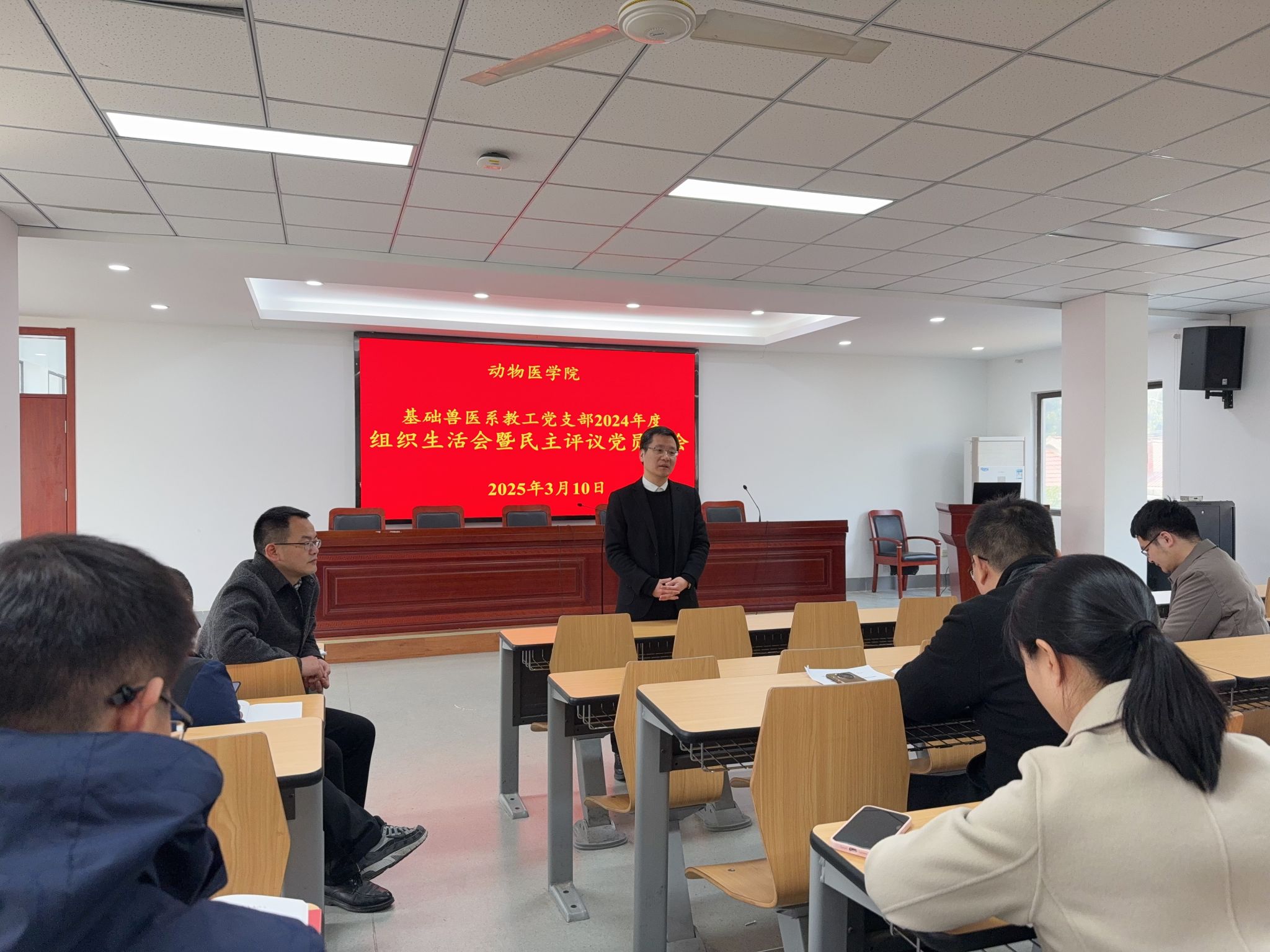 本网讯 3月10日,基础兽医学系教工党支部在动科动医楼318室召开2024年度组织生活会暨民主评议党员大会。院长孙裴出席会议。