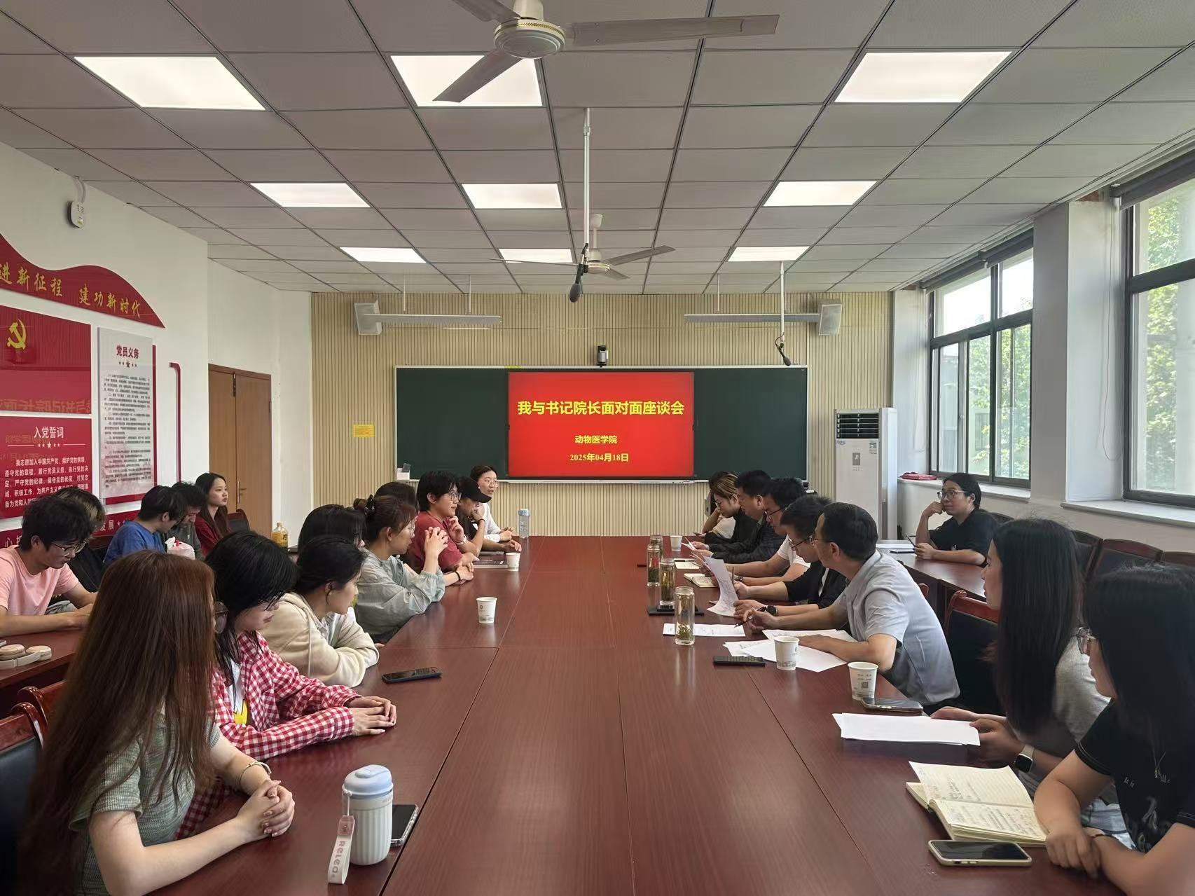 本网讯 4月18日,动物医学院在动医楼306会议室召开“我与书记院长面对面”座谈会。学院党委书记吴永红,院长孙裴,副院长王希春,团学、研究生管理负责老师和各年级学生代表参加会议,会议由学院党委副书记张锐主持。