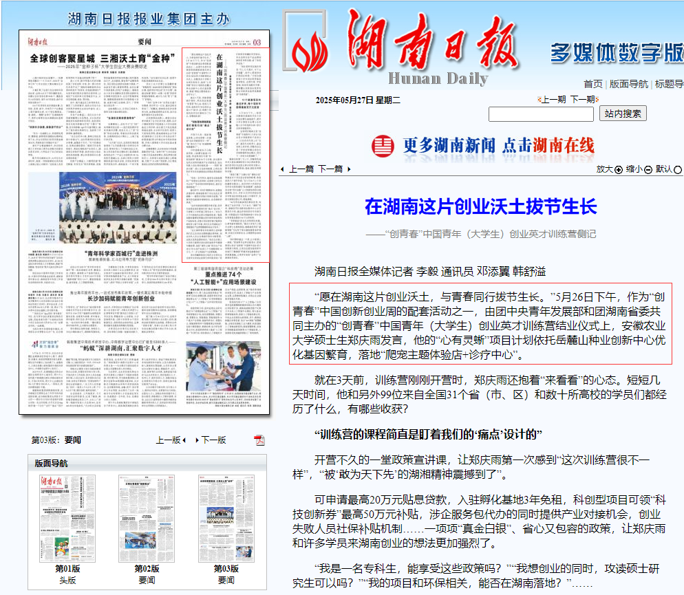 本网讯 5月26日,“创青春”中国青年(大学生)创新创业周创业英才培训营在湖南长沙落下帷幕。安徽农业大学动物医学院研究生郑庆雨带着他主创的“心有灵蜥”项目从全国90所高校100名青年才俊中脱颖而出,以全场最高分斩获路演第一名,并作为优秀创业代表在结营仪式上发言,展现了安农学子卓越的创新创业能力。中央电视台两次报道活动盛况,郑庆雨还接受了湖南日报、掌上长沙等多家媒体专访。