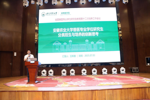 在大会主题交流环节,王希春以"安徽农业大学兽医专业学位研究生分类招生与培养的创新思考"为题作专题报告,系统介绍了我校在兽医专业学位研究生招生培养方面的创新举措。会议期间,我校代表与各培养单位深入探讨了实践成果学位申请标准、生源质量提升策略、培养方案优化、课程体系创新、案例库建设、实践教学体系完善以及人才培养模式改革等核心议题,为推动我国兽医专业学位研究生教育高质量发展贡献了安农智慧。