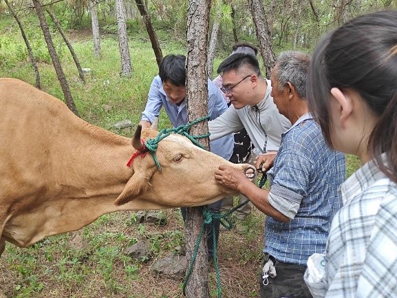 随后,师生们前往鼎立牧业,在吴飞老师的指导下,大家深入山间,对放养的水牛和黄牛进行细致观察,并采集蜱虫样本。蜱虫是一种常见的寄生虫,与动物健康和公共卫生密切相关。此次采集活动不仅为后续的科研工作提供了重要样本,也让师生们亲身体验了科研实践的过程,培养了大家的动手能力和科学探索精神。在采集过程中,大家充分发挥团队协作精神,分工明确、配合默契,确保了采集工作的顺利进行。