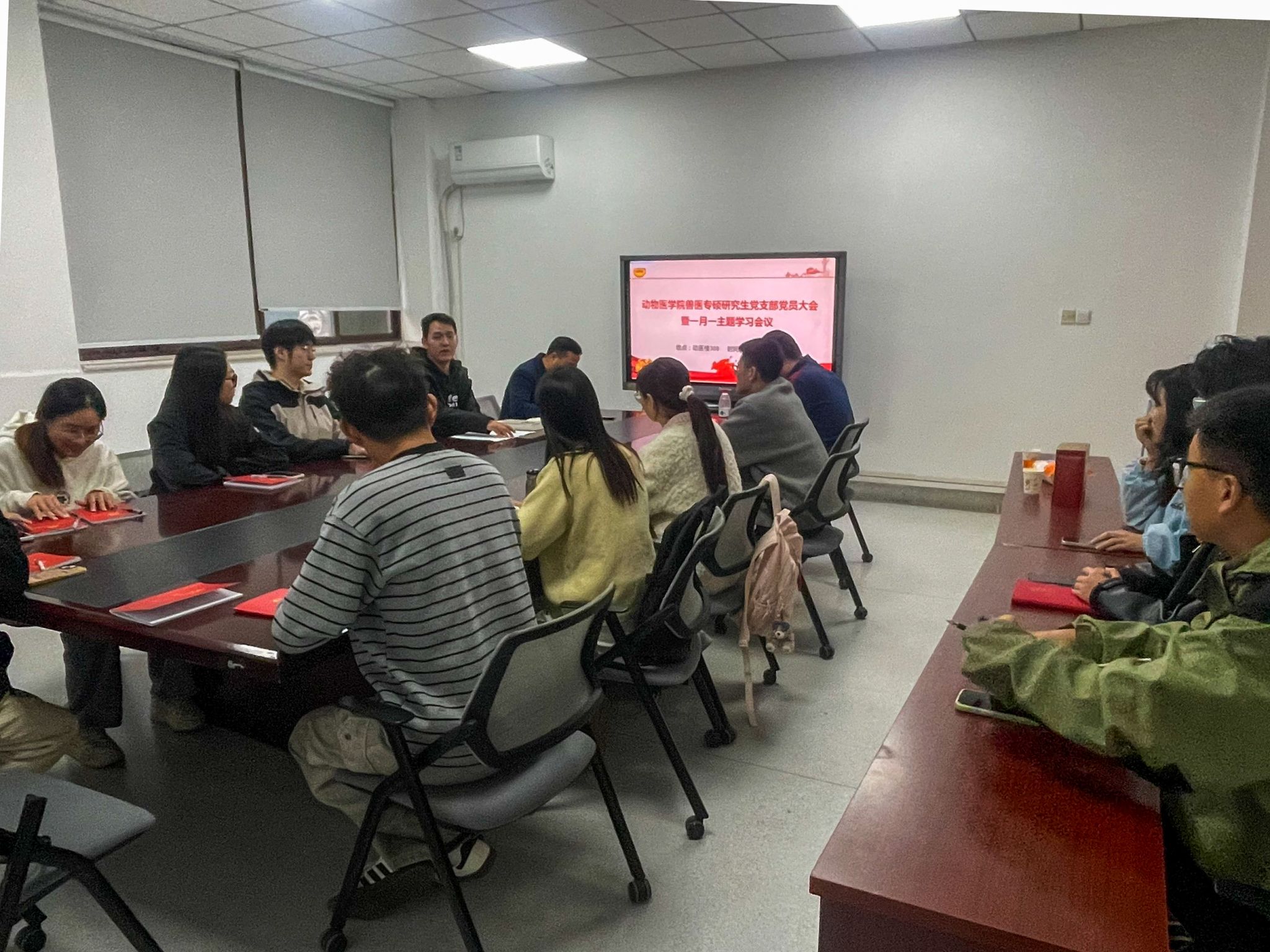 本网讯 10月22日下午,动物医学院兽医专硕研究生党支部在学院308会议室召开党员大会暨“一月一主题”学习会。学院党委副书记张锐、支部全体党员参加会议。