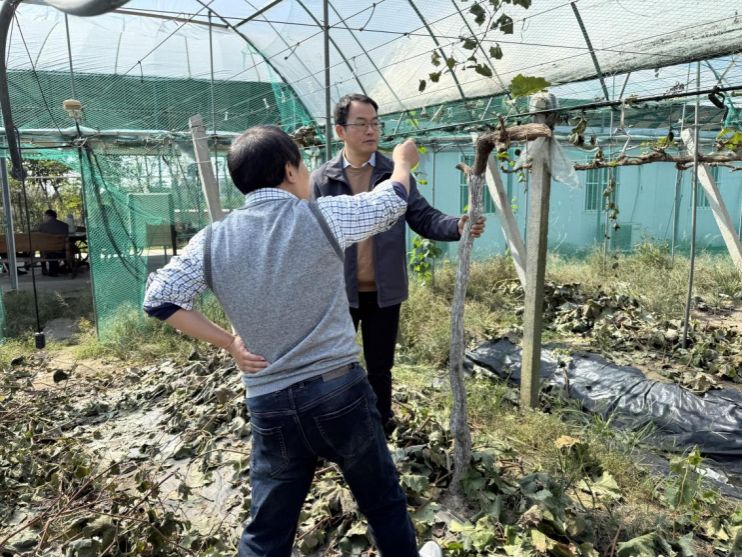 在岭南生态农业葡萄产业园,贾兵教授对阳光玫瑰葡萄的栽培技术进行了细致指导。针对当前品种单一导致的抗市场风险能力弱问题,贾教授建议:“可改种部分巨峰葡萄,形成早中晚熟品种搭配,错峰上市以稳定收益。”此外,团队还对园区内梨树的枝叶修剪进行了示范,并创新提出“猕猴桃与葡萄套种”模式。贾兵教授解释:“猕猴桃为藤本植物,与葡萄立体种植可提高土地利用率,同时减少病虫害交叉感染风险。”