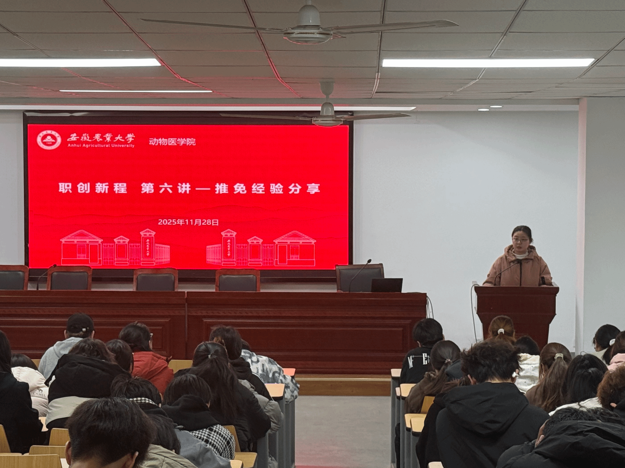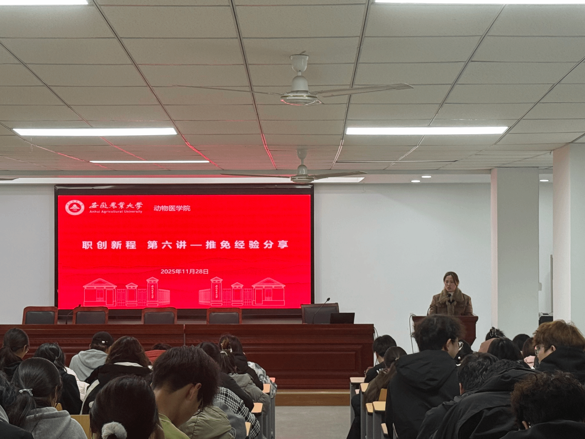 本网讯 11月28日下午,动物医学院在318教室举办“精医讲堂·职创新程”第六讲,会议邀请2025-2026学年优秀推免学子薛方兰、霍欣蕊作主题分享,学院各年级学生100余人参会。