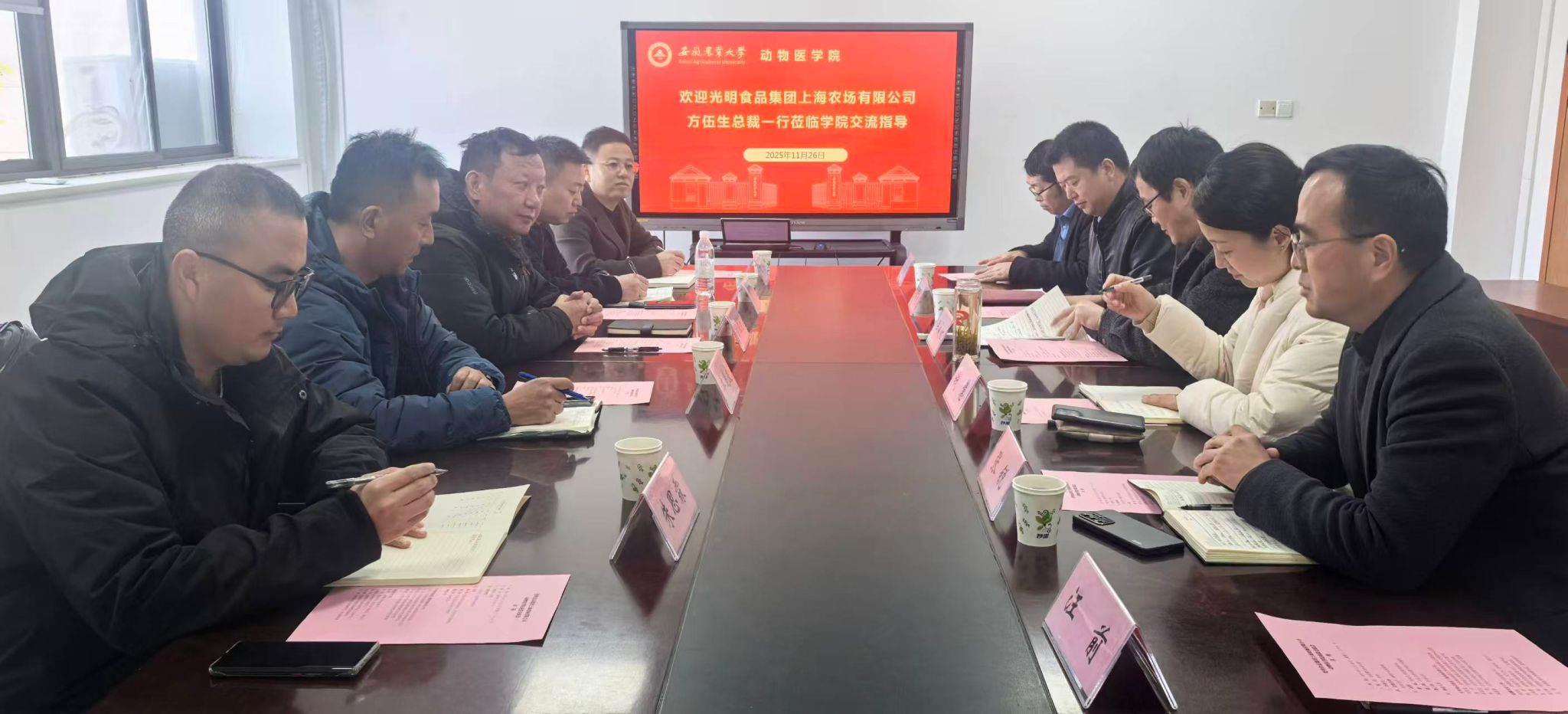 本网讯 11月26日上午,光明食品集团上海农场有限公司总裁方伍生一行来院调研交流,学院党政领导及教学动物医院教师代表参会,会议由学院党委书记吴永红主持。