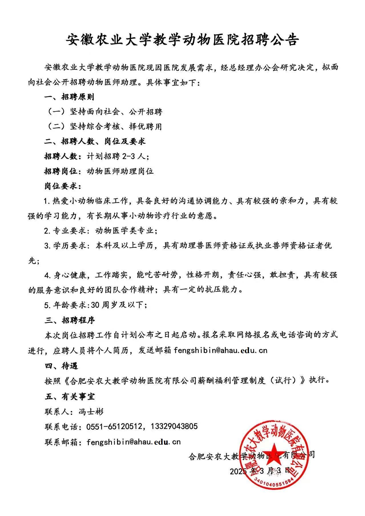 安徽农业大学教学动物医院招聘公告