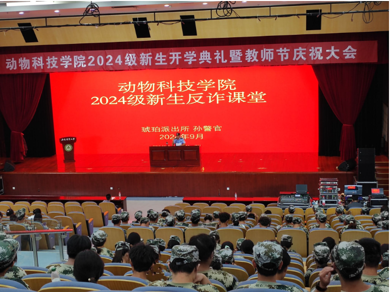 本网讯 9月9日下午,学院在图书馆第一报告厅举办新生反诈教育活动。蜀山区琥珀派出所警官孙健民、学院党委副书记章巍、2024级新生辅导员及全体新生参加本次活动。