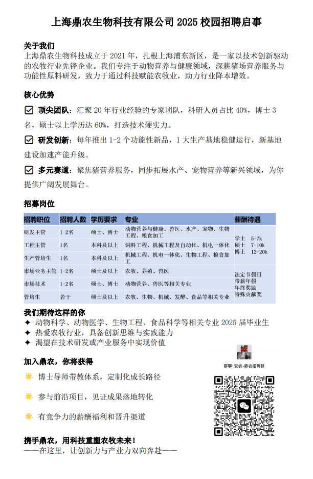 招聘信息-上海鼎农生物科技有限公司 2025 校园招聘启事